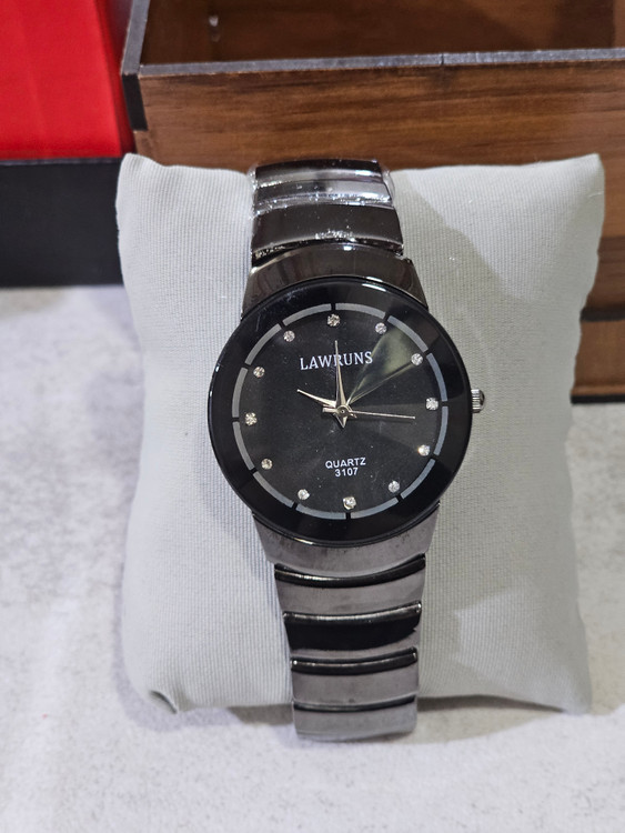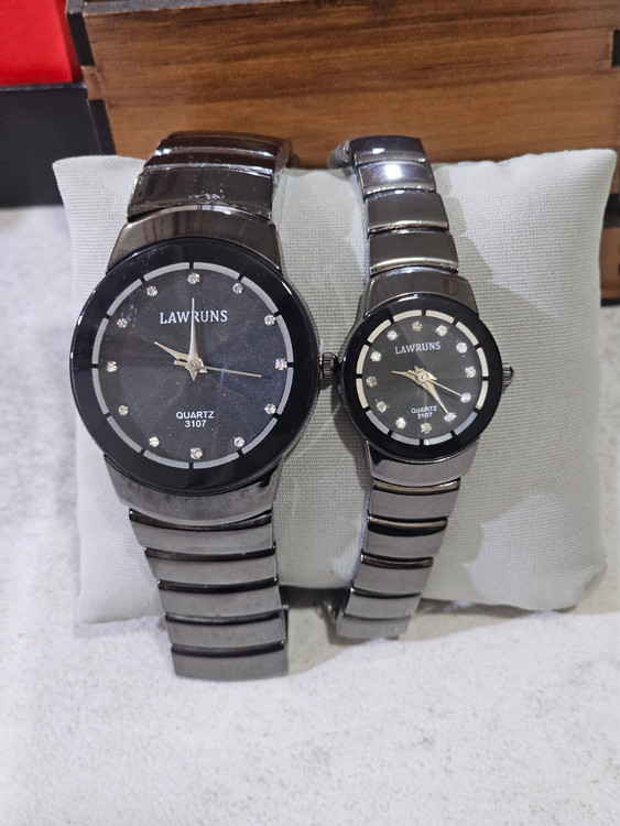 ست ساعت زنانه و مردانه صفحه گرد رنگ مشکی رنگ ثابت مقاوم دربرابر شستشوی دست جنس بندو بدنه فلزی میباشد کاری شیک و اقتصادی مناسب ست با استایل های مختلف
