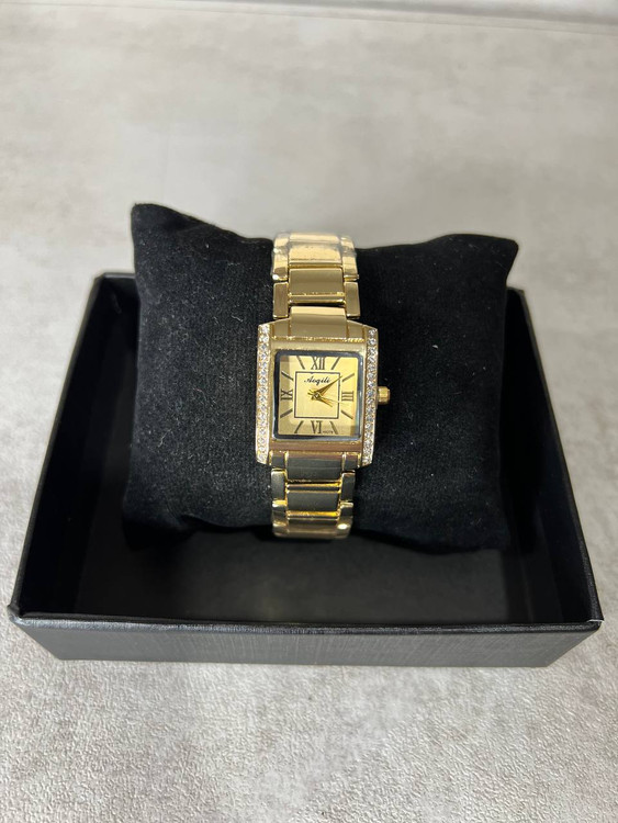 ساعت زنانه طلایی صفحه مستطیل دورنگین باتری قابل تعويض ضدحساسیت و ضدآب دربرابر شستشوی دست است جنس بند فلزی رنگ بند طلایی صفحه طلایی میباشد