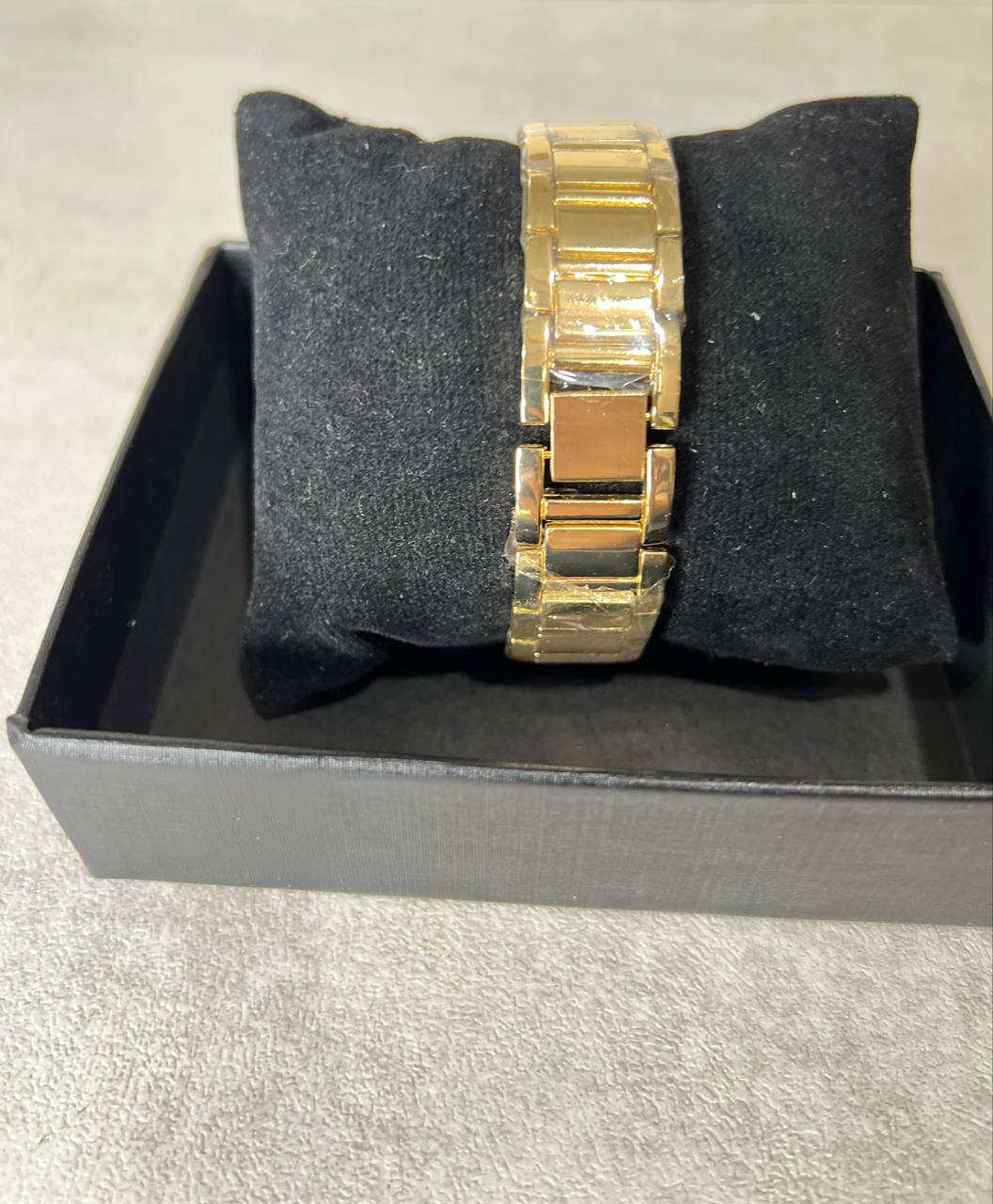 ساعت زنانه طلایی صفحه مستطیل دورنگین باتری قابل تعويض ضدحساسیت و ضدآب دربرابر شستشوی دست است جنس بند فلزی رنگ بند طلایی صفحه طلایی میباشد